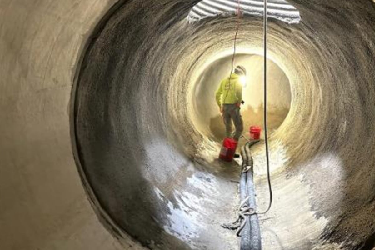 Two sharp bends (62 degrees and 42 degrees) near the South Platte River created a high risk of liner twisting or failure. Insituform collaborated with engineers to modify the approach: the CIPP liner was installed through the 42-degree bend, and Cardinal Coatings applied a geopolymer spray liner through the 62-degree bend.