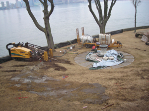 Avertex felt the best way to drill the project was to set up on South Island, drill south under the lagoon to the main Toronto Island and then turn around and drill north to North Island under the other lagoon. The options for getting the drill rig onto South island were to either walk it across the frozen lagoon or barge it in. After some test holes were made in the ice, it was felt that walking on the ice was a little too risky. However, that meant that barging in the drill rig would either involve breaking a substantial thickness of ice or waiting for it to melt. The schedule would not allow time for melting, so a backhoe was put on a hired barge and the barge “dug” its way through the ice to South Island from the open harbor.