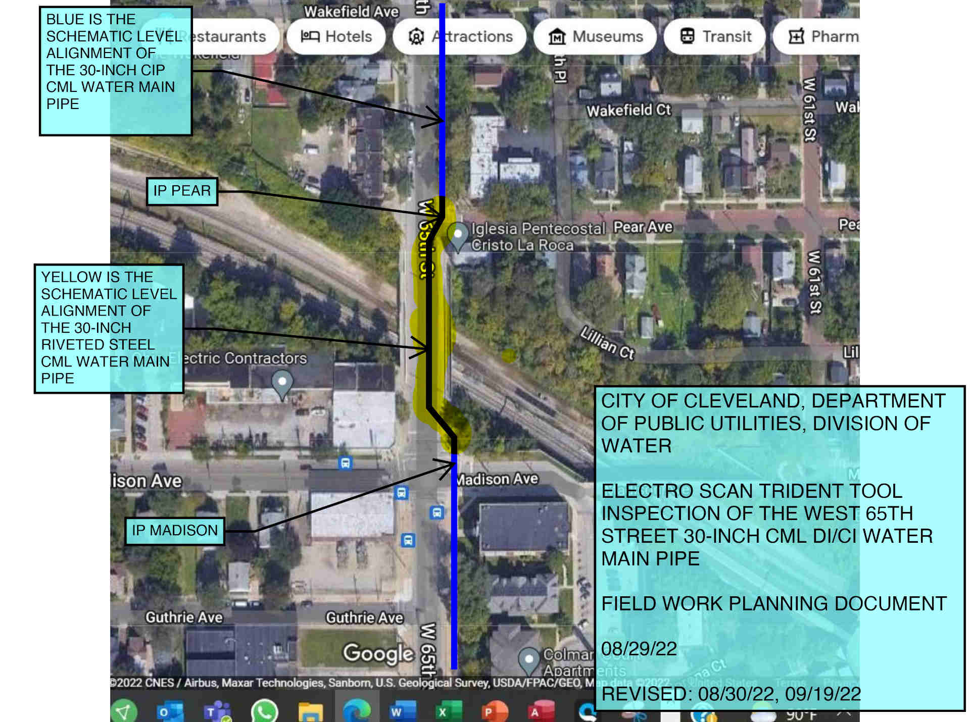 In November 2022, Electro Scan partnered with the City of Cleveland Department of Public Utilities, to inspect a 30-in. cement-mortar-lined ductile iron/cast iron transmission main along West 65th Street. The main runs beneath a railroad corridor and bridge abutments — an area where leaks are difficult to access and even harder to locate from the surface.
