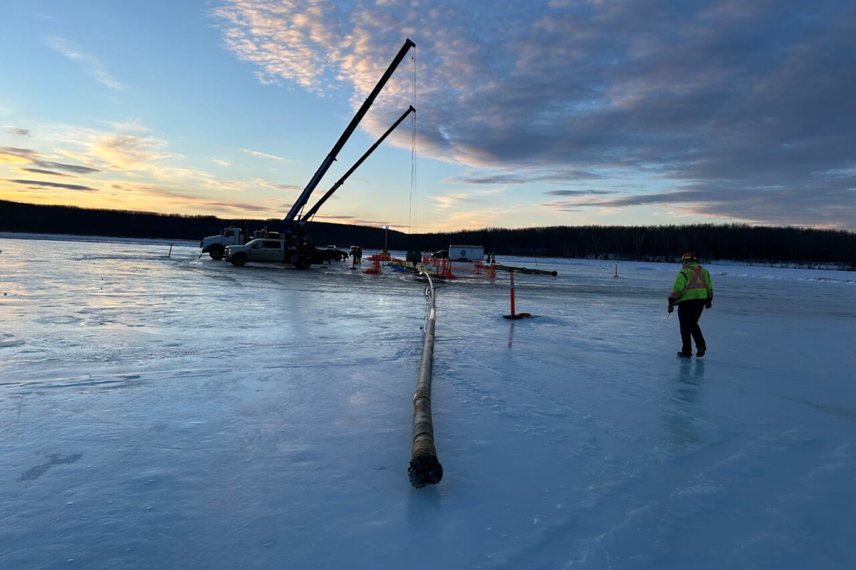 The exit point in the lake required the construction of a narrow exit window through the ice. The pilot hole had to exit at the lakebed approximately 8 m below the frozen surface. The project was time-sensitive as there was a limited time frame that heavy equipment could operate on the ice-covered lake. Crews continuously monitored ice thickness to ensure safe working conditions.