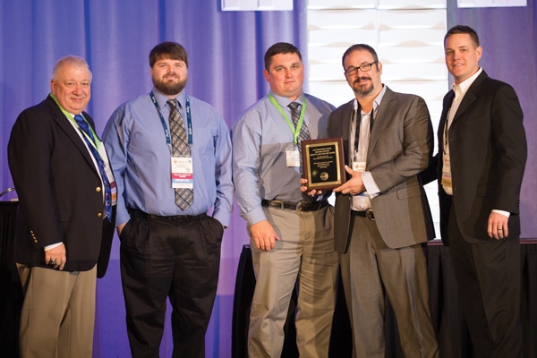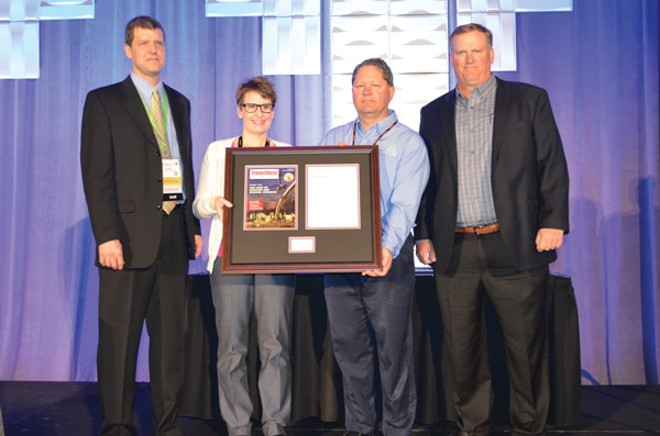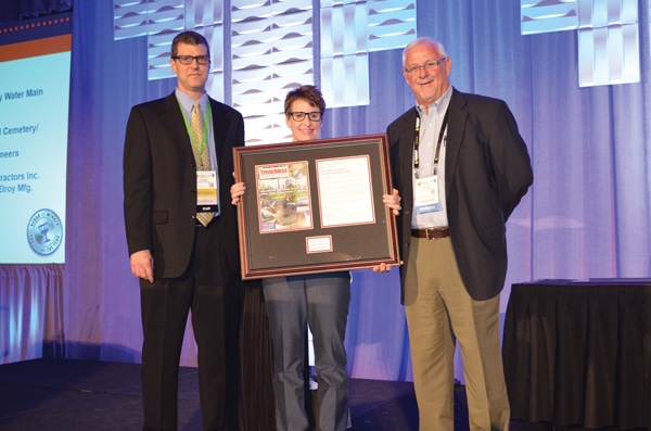 - Tom Hayes with Murphy Pipeline Contractors (right) accepts the 2015 Trenchless Technology Project of the Year award from editors Jim Rush and Sharon M. Bueno.