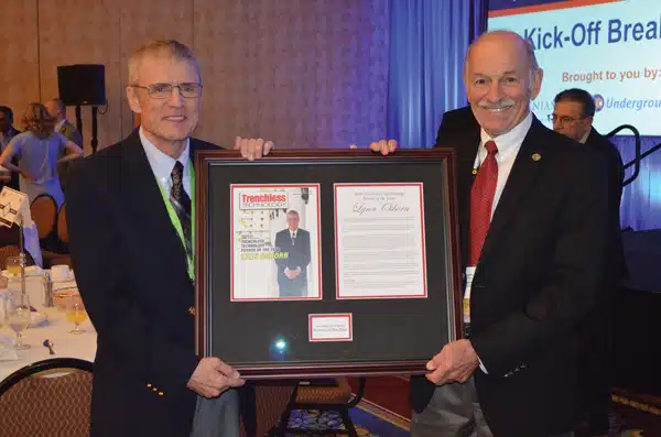 - Trenchless Technology publisher Bernie Krzys (right) presents Lynn Osborn with the Person of the Year Award.