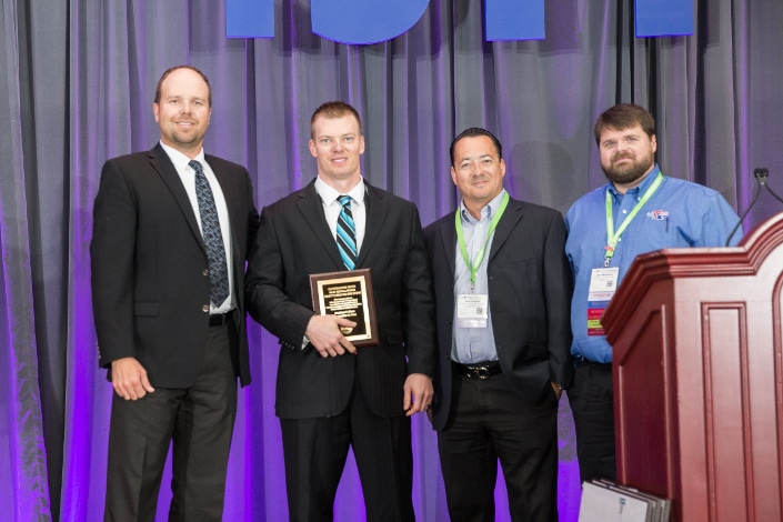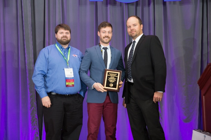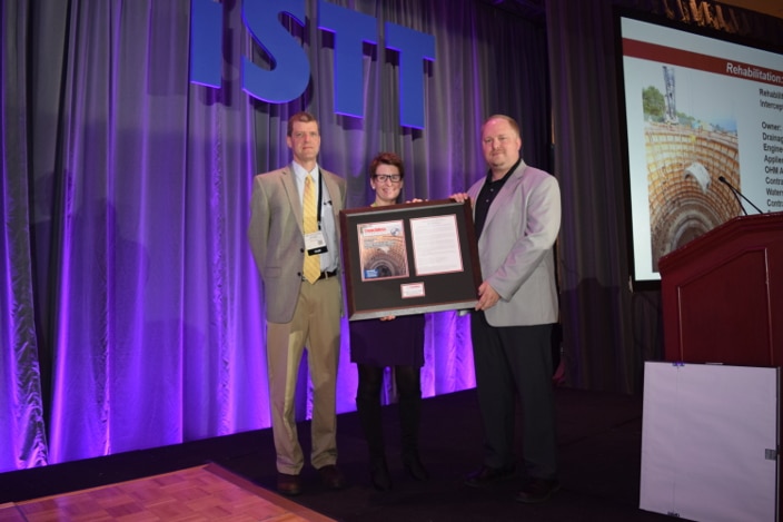 NASTT’s John Matthews (left) and Jeff Maier (right) present Matt Olson of (Staheli Trenchless Consultants with the Outstanding Paper Award for Rehabilitation Award at the Kick-Off Breakfast.