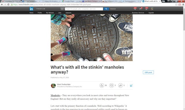 Twitter (I am @NoDigMaine) first and foremost your twitter handle says something about you, who you are, and people identify with it so choose wisely. A good friend Richie Sheridan, a regional sales manager for CUES, has one of the best Twitter handles with @PipelineCCTV —this clues you in immediately to his core business and area of expertise. Twitter is a fun social site that I use for sharing pictures of things related to our business and particularly #Drainspotting.