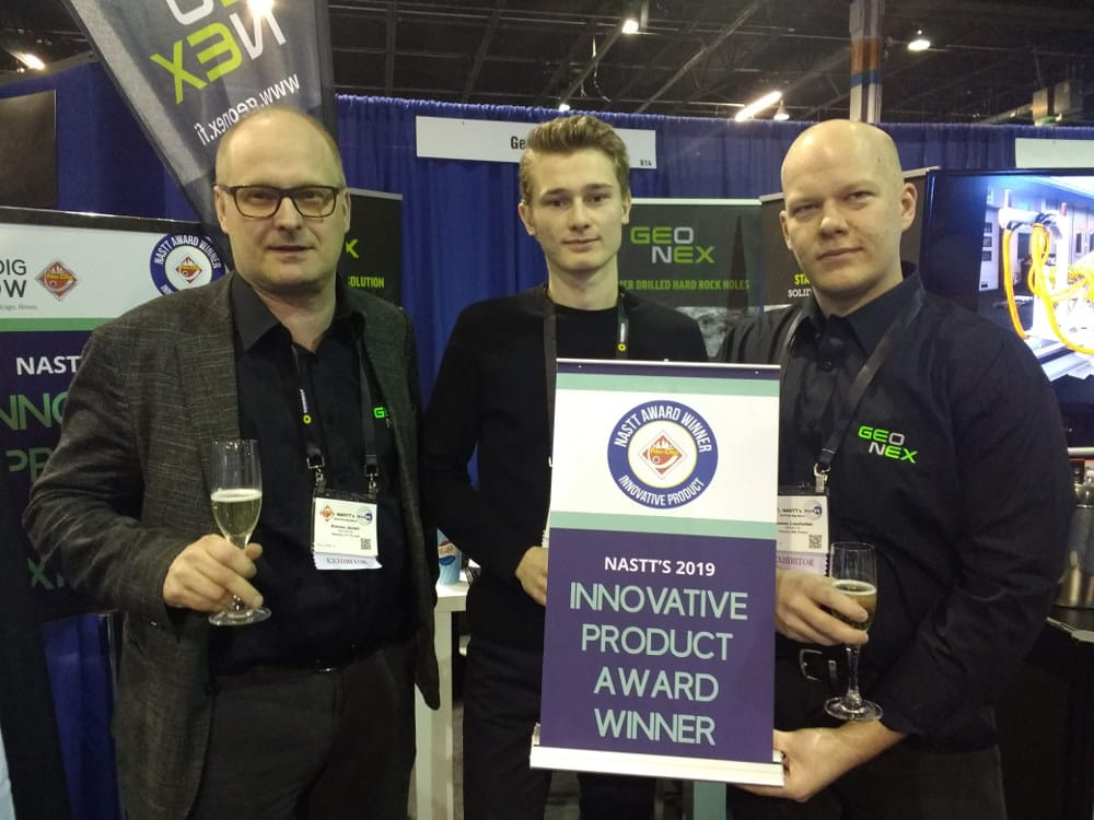 The Geonex Oy DTH-hammer drilling system received the Innovative Product Award for New Installation. Geonex’s system works with steel casing or without casing in solid rock and performs best in hard rock and mixed soil conditions, where rock quality creates significant costs with tricone bits or in mixed soil conditions that cannot be supported with drilling fluids. Method is direct pipe installation method and operates with an air percussion hammer.